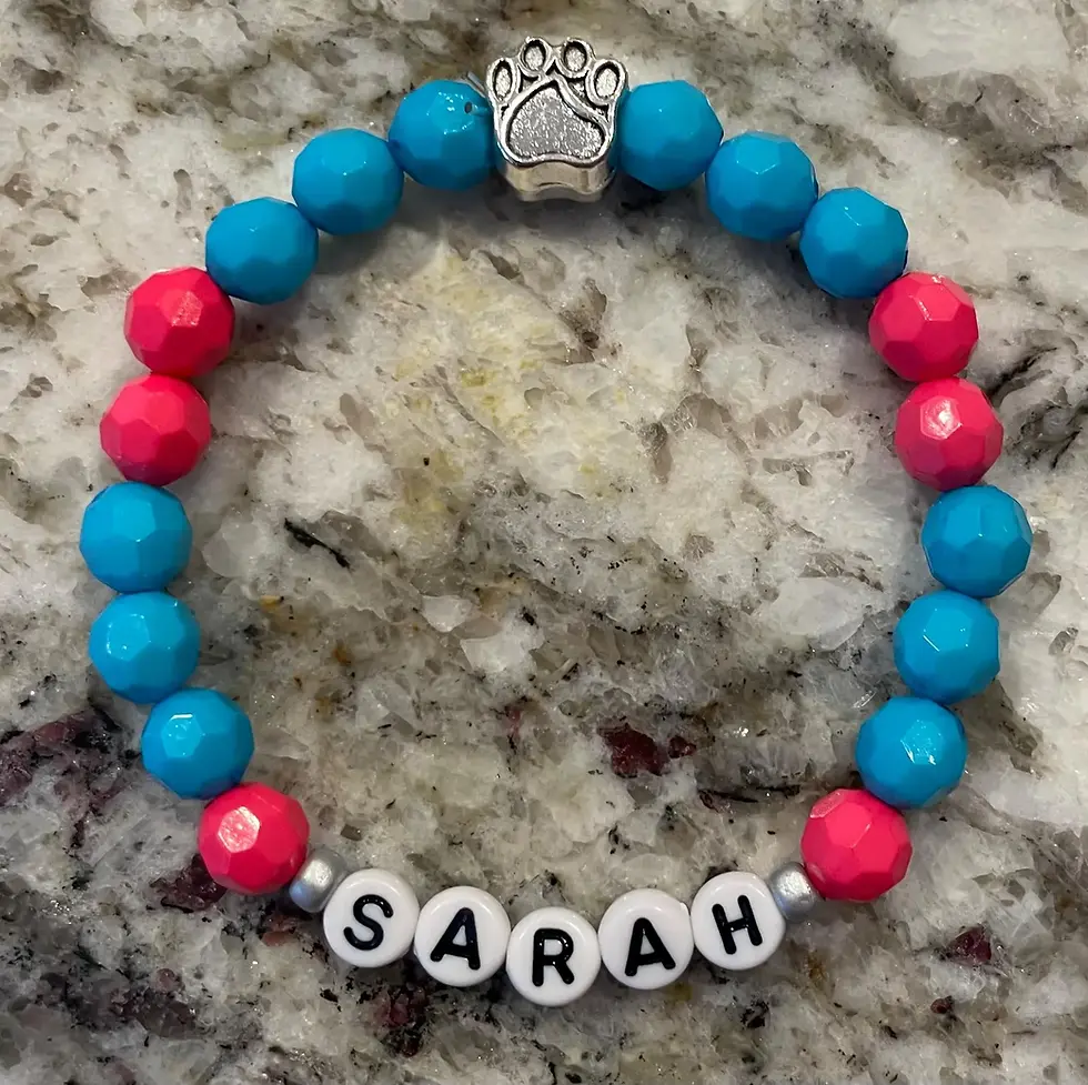 I began making pet remembrance bracelets for veterinary offices to offer to pet parents following euthanasia. These complimentary bracelets made with a rainbow of bead colors and a paw print charm. Some contain phrases such as, "Missed," "Loved," "Friend," "and Run Free."